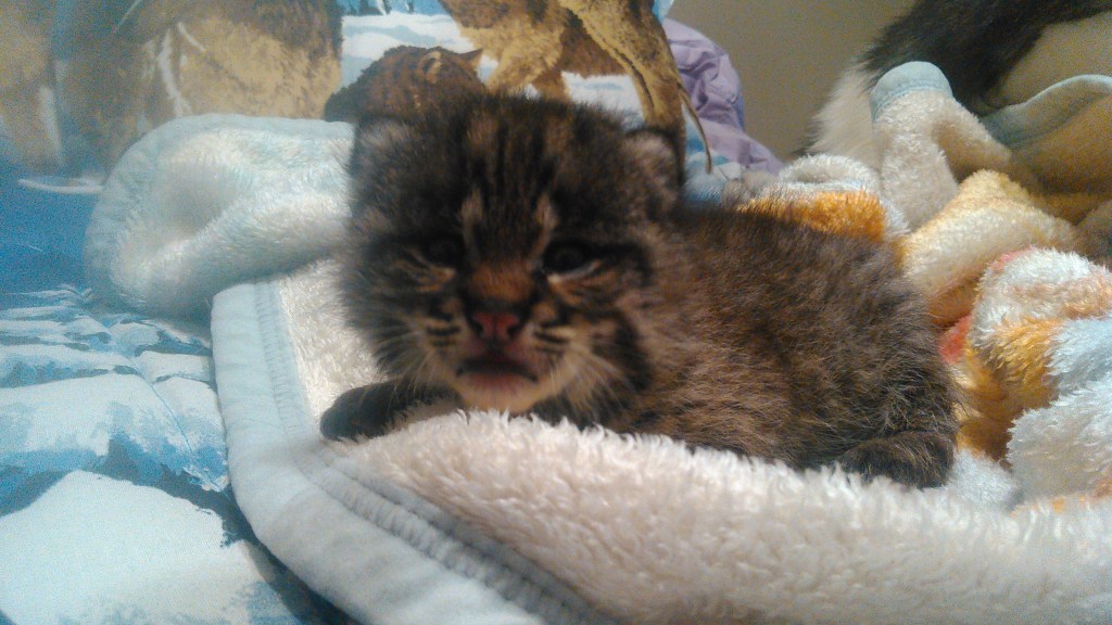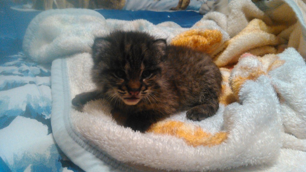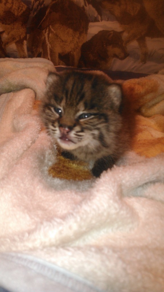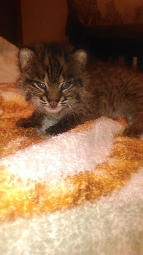We have had several baby bobcats come through our center over the last 11 years .They are a very unique animal.. Their eyes are the clearest of blues, and they have spots. They are NOT like your domestic house cat..