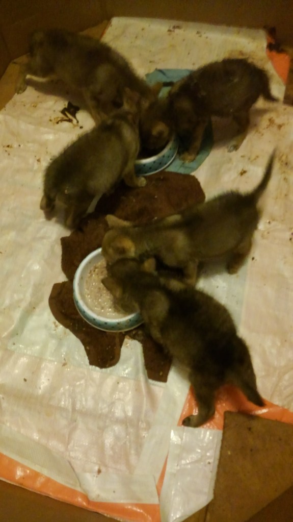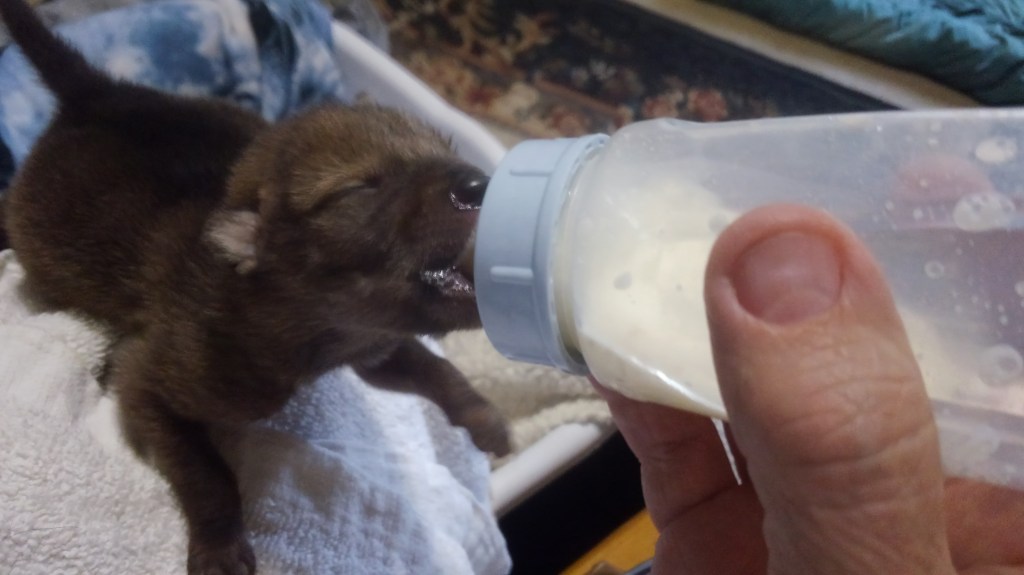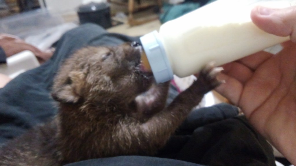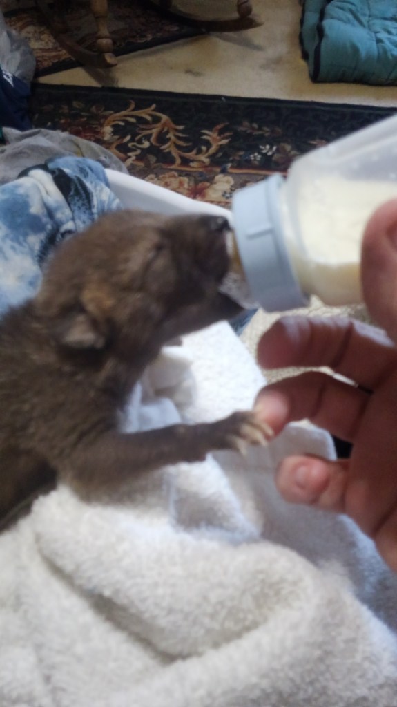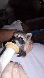We feed a variety of foods from the time we get an 8 oz animal to the time we release them. We start them out on “FOX VALLEY FORMULA’S” which is all we use here… Weaning time is a challenge and a very messy time which in turn calls for many many baths…. But it is a very fun time too… One of our favorites.