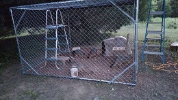 Our center has several enclosures all for different purposes and different animals….When we bring in tiny new babies we like to keep them close at hand to watch and monitor their well being. Until we are able to get a separate small nursery house (which we are striving to raise money to get this season) we have a section of our house with an enclosure that we keep nursing boxes and baskets in for these tiny ones…. After they are weaned we have two enclosures on our back deck they get moved out to for the next few months, so we can closely watch them…As they grow older and get closer to release they go to enclosures farther away from us and the house to get adjusted to the outdoors and woods where they will be released, usually at 6-8 months depending on the animal.